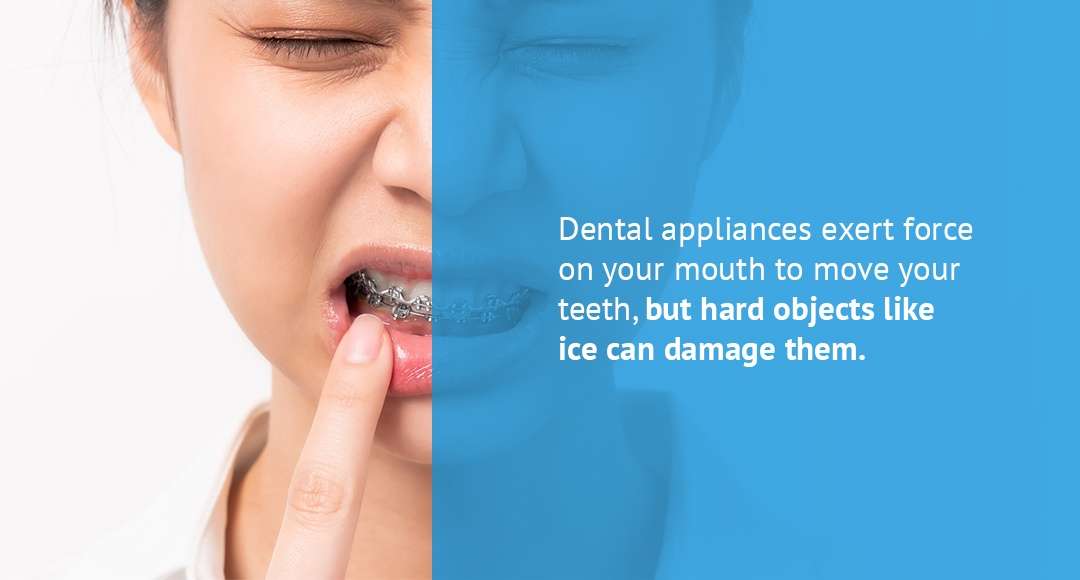 Do you wear braces, a palate expander, spacers, retainers, or any other dental device? You should avoid chewing ice. Dental appliances exert force on your mouth to move your teeth, but hard objects like ice can damage them. Then, they may not do their job correctly, and can even cause your teeth to move the wrong way.
